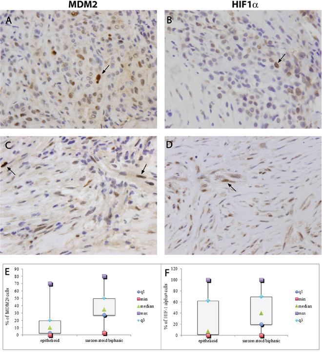 Figure 2: MDM2 strong nuclear immunostaining in tumor samples from epithelioid and sarcomatoid/biphasic mesothelioma. A, C. HIF1alpha strong nuclear immunostaining in tumor samples from epithelioid and sarcomatoid/biphasic mesothelioma B, D. Arrays indicate emblematic strong marked nuclei. Original maginification × 320. Box plots are representative of MDM2 and HIF1alpha positive cells, and report minimum (min) and maximum (max) values, median and first (q1) and third (q3) quartile E, F. * statistically significant.