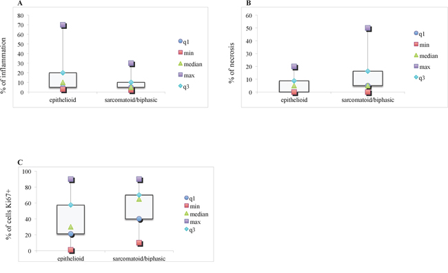 Figure 3: Inflammation, necrosis and Ki67 strong nuclear expression levels in tumor samples from epithelioid (N = 32) and sarcomatoid/biphasic (N = 28) mesothelioma. Box plots are representative of the percentage of inflammation A. of necrosis B. within tumor samples, and of cells positive for Ki67 at the immunohistochemistry C. minimum (min) and maximum (max) values, median and first (q1) and third (q3) quartile are reported. * statistically significant.