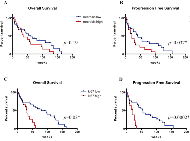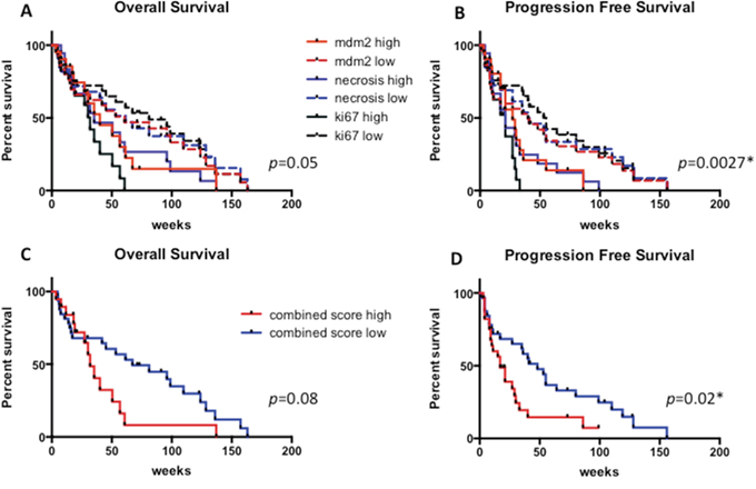 Univariate (log rank Mantel Cox test) and multivariate (Cox Regression Proportional Hazards Model) analyses were performed to show any possible impact of molecular markers, pathological parameters and clinical features on PFS and OS. Necrosis, proliferation index and MDM2 levels were also combined in a “combined score” and considered in OS and PFS analyses.