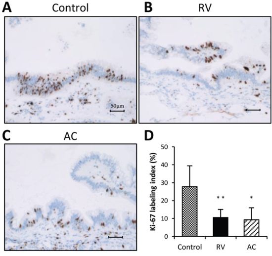 As summarized in Table 2, dysplasia and ductal adenocarcinoma developed in the pancreas of all groups, and there was no difference in the incidence of dysplasia between the groups. However, the incidence of adenocarcinomas in both RV and AC groups was significantly decreased as compared to those in the control group (control, RV and AC: 54%, 8% and 8%, respectively, p < 0.05). The proliferative potential of pancreatic ductal dysplasia was investigated by Ki-67 immunostaining (Figure 1). The Ki-67 labeling index in ductal dysplasia was significantly decreased by RV and AC treatments (p < 0.01 and p < 0.05, respectively).