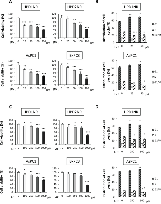Figure 2: Anti-proliferation effects of RV and AC in hamster (HPD1NR and HPD2NR) and human (AsPC1 and BxPC3) pancreatic cancer cell lines. A. and C. Significant decreases in the cell viability of four cell lines were observed in a dose-dependent manner after RV (A) and AC (C) treatments by the WST-8 assay. Values are means ± SD, n = 4. B. and D. Guava® cell cycle analysis of HPD1NR and AsPC1 treated with RV (B) or AC (D) Values are means ± SD, n = 3 in each, *P < 0.05, **P < 0.01 and ***P < 0.001 as compared to controls.