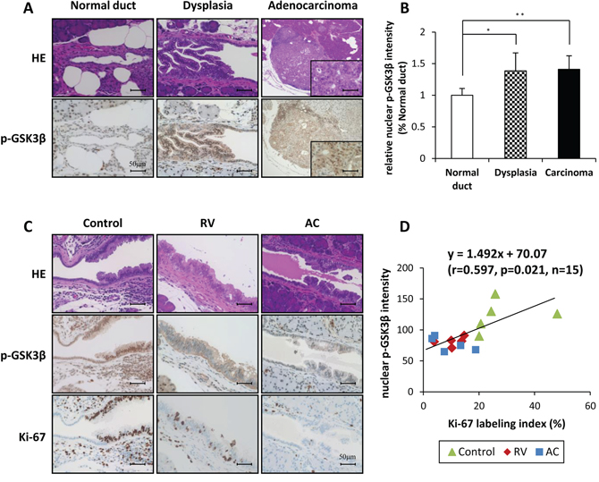 Phosphorylated GSK3βSer9 expression in the nucleus of ductal dysplasia is reduced by RV and AC