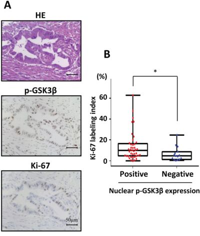 Figure 6: Analysis of proliferative activity using human pancreatectomy specimens according to positive or negative nuclear phosphorylated GSK3βSer9 expression. A. Representative immunohistochemical staining for phosphorylated GSK3βSer9 in human pancreatic cancer. B. Correlation analysis of Ki-67 labeling index and nuclear phosphorylated GSK3βSer9 expression in human pancreatic cancer (*P < 0.05).