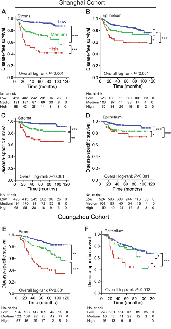 Figure 3: Effects of stromal POSTN expression in predicting postoperative prognoses of CRC patients with or without postoperative chemotherapy in both cohorts. A. DFS of stage I-II CRC patients without chemotherapy in Shanghai cohort. B. DFS of stage II CRC patients with postoperative chemotherapy in Shanghai cohort. C. DFS of stage III CRC patients with postoperative chemotherapy in Shanghai cohort. D. DSS of stage I-II CRC patients without chemotherapy in Shanghai cohort. E. DSS of stage II CRC patients with postoperative chemotherapy in Shanghai cohort. F. DSS of stage III CRC patients with postoperative chemotherapy in Shanghai cohort. G. DSS of stage I-II CRC patients without chemotherapy in Guangzhou cohort. H. DSS of stage II CRC patients with postoperative chemotherapy in Guangzhou cohort. I. DSS of stage III CRC patients with chemotherapy in Guangzhou cohort. Abbreviations and marks: CRC, colorectal carcinoma; DFS, disease-free survival; DSS, disease-specific survival; •, P > 0.05; *, P < 0.05; **, P < 0.01; ***, P < 0.001.