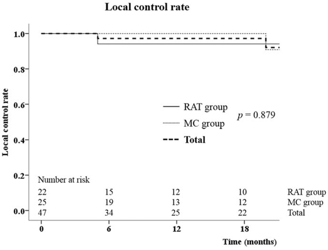 Table 1 compares the patient and tumor characteristics between the RAT and MC groups. There were no statistically significant differences in baseline characteristics between RAT and MC groups, except for the number of treated targets. In the RAT group, 6 (50%) patients received SBRT on multiple targets (three patients for two targets, two patients for three targets, one patient for four targets). In contrast, only two (8.7%) patients received SBRT on multiple targets in the MC group. Other characteristics including patient age, sex, classification, tumor site, location, pathology and tumor size showed no meaningful difference between the groups. The dose prescription policy between the two groups also did not differ.