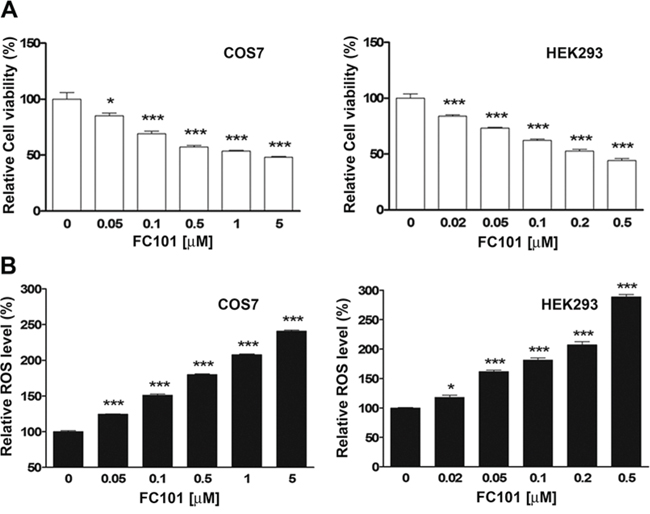 Figure 1: FC101 reduces cell viability and coincidently induces ROS in COS7 and HEK293 cells. COS7 and HEK293 cells were exposed to FC101 at indicated concentrations for 24 h. (A) Cell viability was evaluated using one solution reagent. (B) ROS level was detected using CM-H2DCFDA. All data represent the means ± SE (n = 3). *P < 0.05, ***P < 0.001.