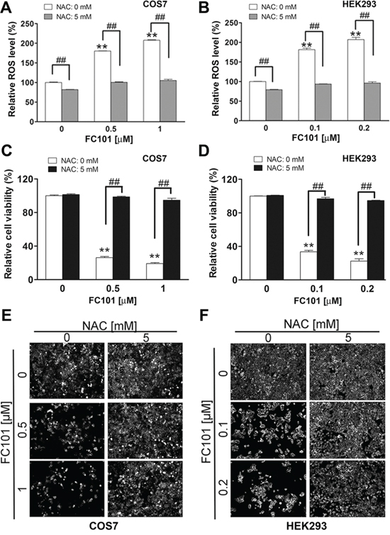 Figure 2: N-acetyl-L-cysteine (NAC) prevents FC101 from inducing ROS and cell death. COS7 and HEK293 cells were pretreated with NAC (5 mM) for 1 h. (A and B) The Cells were then exposed to FC101 at indicated concentrations for 24 h, (C and E) for 6 days (for COS7), or (D and F) for 4 days (for HEK293), followed by ROS detection (A and B), cell viability assay (C and D), morphological analysis (E and F). All data represent the means ± SE (n = 3). *P < 0.05, **P < 0.01, ##P < 0.01.