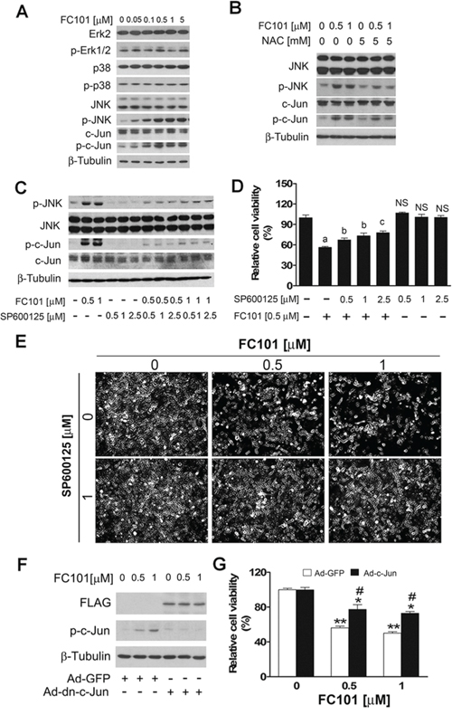 Figure 3: FC101-inducted ROS activates JNK cascade, leading to cell death. (A) COS7 cells were exposed to FC101 at indicated concentrations for 24 h, (B) pretreated with NAC (5 mM) for 1 h, or (C) pretreated with SP600125 for 30 min, and then exposed to FC101 for 24 h, followed by Western blotting with indicated antibodies. Similar results were observed in at least 3 independent experiments. (D and E) COS7 cells were pre-treated with/without the JNK inhibitor SP600125 for 30 min, and then treated with/without indicated concentrations of FC101 for 24 h, followed by cell viability assay (D) and morphological analysis (E), respectively. (F and G) COS7 cells, infected with recombinant adenovirus encoding FLAG-tagged dominant negative c-Jun (Ad-dn-c-Jun) or GFP (control) for 24 h, were exposed to FC101 (0–1 μM) for 24 h, followed by Western blotting (F) and cell viability assay (G). All data represent the means ± SE (n = 3). NS, no significant difference, aP < 0.01, difference with the control group, bP < 0.05, cP < 0.01, difference with the 0.5 μM FC101 group, *P < 0.05, **P < 0.01, difference with the control group. #P < 0.05, the Ad-dn-c-Jun group vs the Ad-GFP group.
