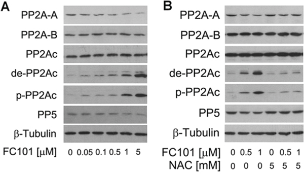 Figure 4: FC101 induction of ROS downregulates PP2A and PP5. (A) COS7 cells were treated with 0–5 μM FC101 for 24 h, or (B) pretreated with/without NAC (5 mM) for 1 h, and then exposed to FC101 (0–1 μM) for 24 h, followed by Western blot analysis with indicated antibodies. Similar results were observed in at least 3 independent experiments.