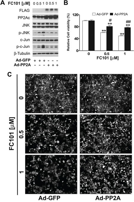 Figure 5: Overexpression of PP2A partially prevents FC101-induced JNK activation and cell death. (A-C) COS7 cells infected with Ad-PP2A and Ad-GFP (as control) were exposed to the indicated concentrations of FC101 for 24 h, followed by Western blot analysis with indicated antibodies (A), morphological analysis (B), and cell viability assay (C). Similar results shown in (A and B) were observed in at least 3 independent experiments. All data shown in (C) represent the means ± SE (n = 3). *P < 0.05, **P < 0.01, difference with the control group, #P < 0.05, ##P < 0.01, the Ad-PP2A group vs the Ad-GFP group.