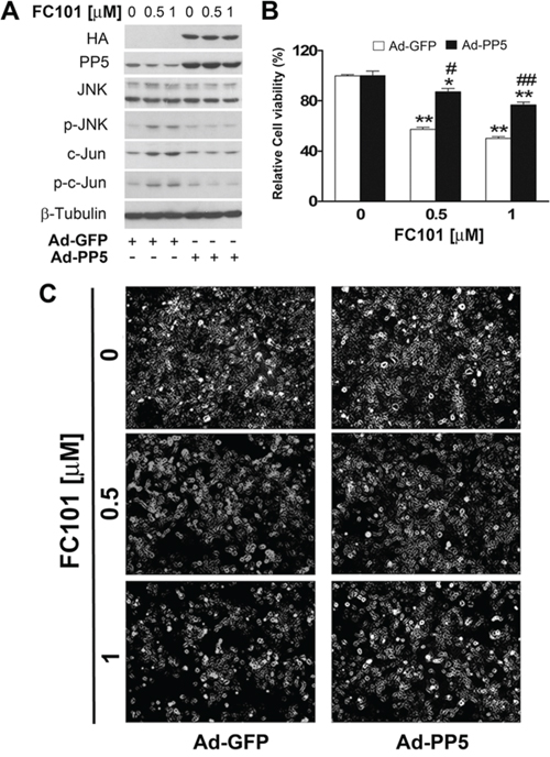 Figure 6: Overexpression of PP5 partially prevents FC101-induced activation of JNK as well as cell death. (A-C) COS7 cells, infected with Ad-PP5 or Ad-GFP (as control), were exposed to exposed to indicated concentrations of FC101 for 24 h, followed by Western blot analysis with indicated antibodies (A), morphological analysis (B), and cell viability assay (C). Similar results shown in (A and B) were observed in at least 3 independent experiments. All data shown in (C) represent the means ± SE (n = 3). *P < 0.05, **P < 0.01, difference with the control group, #P < 0.05, ##P < 0.01, the Ad-PP5 group vs the Ad-GFP group.