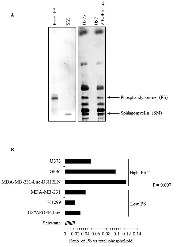 Figure 4: Human cancer cells differ in total cellular PS content. A. TLC profile of phospholipids from U87ΔEGFR-Luc and U373 cell lines, with purified brain PS and SM run as molecular standards. B. Total PS estimated in the indicated cell lines by phosphorus assay from scraped PS bands obtained from TLC, expressed as the ratio of phosphorous obtained from scraped PS band and phosphorous from total phospholipids.