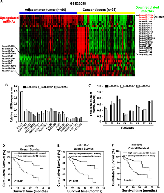 Figure 1: Downregulation of miR-214/199a/199a* in HCC is correlated with poor patient survival. (A) expression profiling of miRNAs in 96 primary HCC tissues and 96 adjacent non-tumor tissues (NCBI/GEO/GSE22058) (B) miR-214/199a/199a* expression was analyzed in immortalized human hepatocyte epithelial cell line THLE3, and indicated human HCC cell lines using qRT-PCR. (C) Relative expression of miR-214/199a/199a* in 8 pairs of HCC tumor tissues (T) compared to their corresponding adjacent noncancerous tissues(ANT). Kaplan–Meier correlation analysis between miR-214 (D) miR-199a* (E) and miR-199a (F) levels and overall survival of patients with HCC with high and low miR-214 expression.