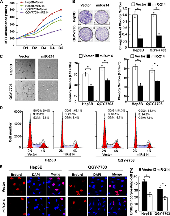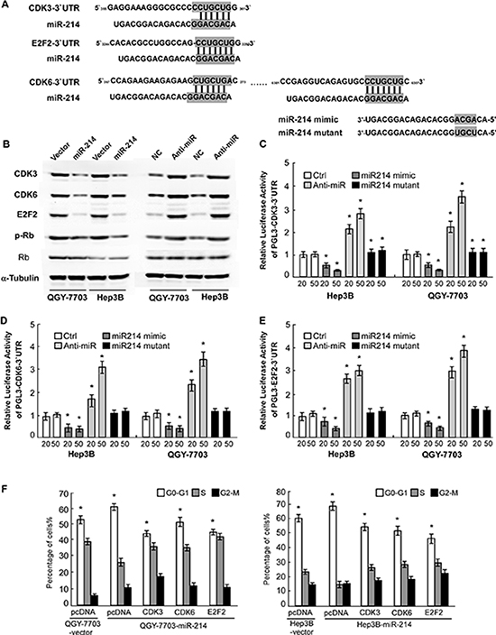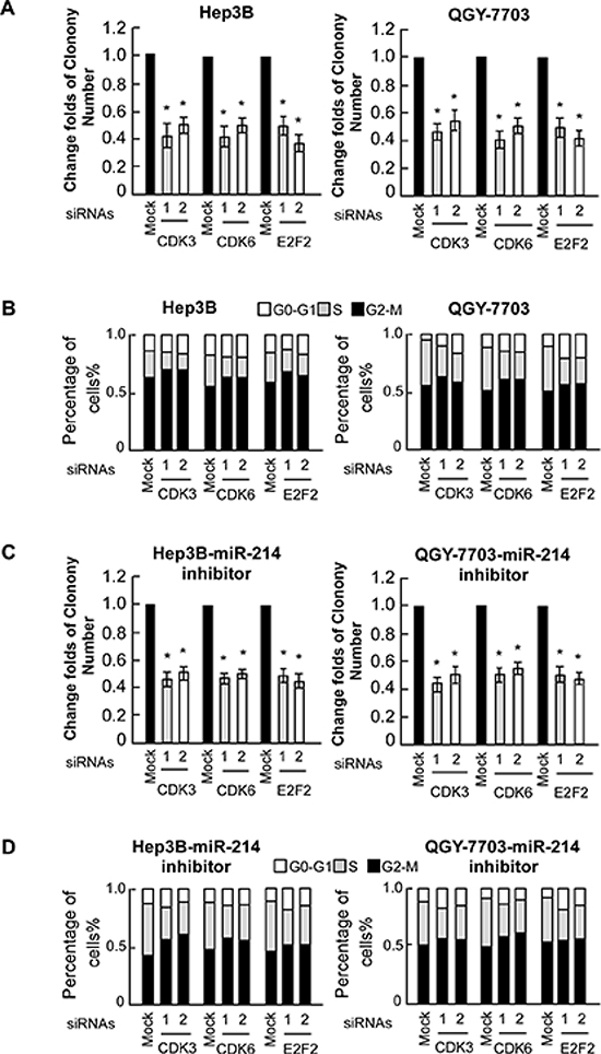 microRNAs (miRNAs) which suppress multiple genes at the same time can provide new clues for the development of targeted therapies against HCC. As a single miRNA can inhibit multiple mRNAs and synergistically suppress various regulators that are cooperatively involved in cell-cycle regulation, identification of such miRNAs might help us to develop targeted therapies against HCC carcinogenesis. Notably, miR-214 was of particular interest as our informatics analysis predicted potential binding sites for miR-214 in the 3-untranslated regions (3′-UTR) of E2F2, CDK3, and CDK6, 3 key regulators of the cell cycle. In this study, we show that miR-214 causes cell-cycle arrest by inhibiting E2F2, CDK3, and CDK6. Importantly, miR-214 expression in HCC cells is markedly reduced, resulting in unrestricted cell-cycle progression and consequently increased cell proliferation. Moreover, miR-214 down-regulation correlates with poor prognosis of patients with HCC, suggesting that miR-214 might act as a tumor-suppressor miRNA in the development and progression of HCC.