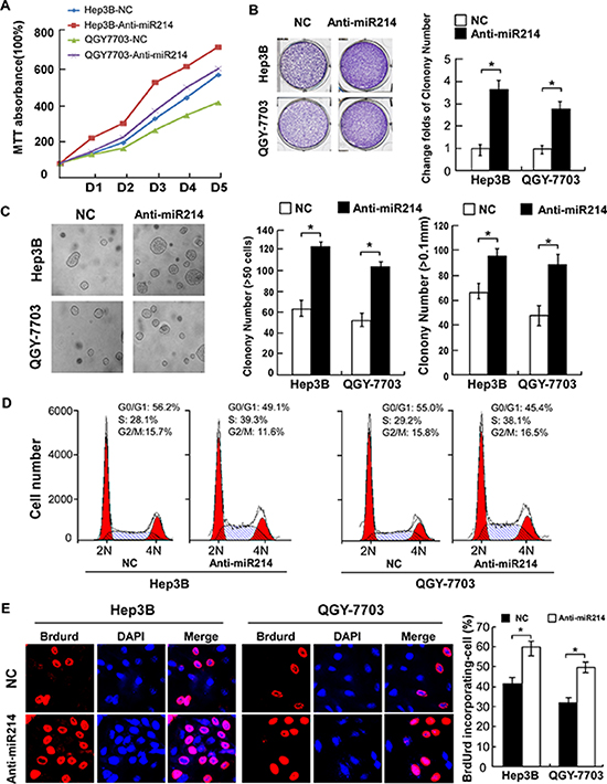 A DNA fragment containing the hsa-miR-214 precursor with 300 bp flanking sequence of each side was amplified into retroviral transfer plasmid pMSCV-puro (Clontech, Palo Alto, CA). Retroviral production and infection were performed as standard procedure. The open reading frames (ORFs) of CDK3, CDK6 and E2F2 generated by PCR amplification were cloned into the mammalian expression vector pcDNA3.1 (Invitrogen). 3′-UTRs of CDK3, CDK6 and E2F2 were amplified and then cloned into the downstream of the luciferase gene in a modified pGL3 control vector (Promega, Madison, WI). miR-214 mimics, anti-miR-214 oligonucleotides and their relative control oligonucleotides were purchased from Invitrogen. For depletion of genes, FlexiTube GeneSolution were used to knockdown for CDK3(GS1018, GIAGEN), CDK6(GS1021, GIAGEN), E2F2(GS1870, GIAGEN). QGY-7703/vector cells and QGY-7703/miR-214 HCC cells were infected with PMSCV-neo-luc2(QGY-7703/vector-luc cells and QGY-7703/miR-214-luc) to be tracked in vivo through bioluminescent imaging assay.