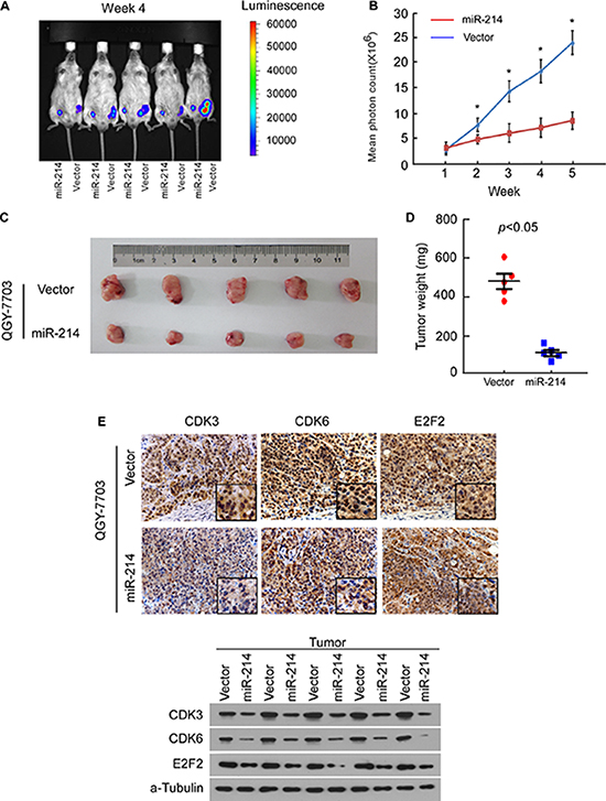 Male BALB/c-nu mice (4–5 weeks of age, 15–18 g) were housed in barrier facilities on a 12 hours light/dark cycle. All experimental procedures were approved by the Institutional Animal Care and Use Committee of Sun Yat-Sen University. For the bioluminescent imaging assay, indicated cells (7 × 106, suspended in 100 mL sterile PBS, QGY7703-luc-Vector left and QGY7703-luc-miR-214 right) were injected subcutaneously into the flank of each dorsal thigh of BALB/C nude mice (n = 5). To estimate the tumor growth, bioluminescent imaging was also taken by using Xenogen IVIS Spectrum (Caliper Life Sciences). Fifteen minutes prior to imaging, mice were injected intraperitoneally with 150 mg/kg luciferin. Following general anesthesia, images were taken and analyzed with Spectrum Living Image 4.0 software (Caliper Life Sciences). After 5 weeks, mice were anesthetized and sacrificed, and tumors were removed, weighed, and sectioned, followed by real-time PCR analysis and immunohistochemical (IHC) analysis. After deparaffinization, sections were immunohistochemically analyzed using anti-CDK3, anti-CDK6, and anti-E2F2 antibodies (BD PharMingen). The resultant immunostaining images were captured using the AxioVision Rel.4.6 computerized image analysis system (Carl Zeiss).