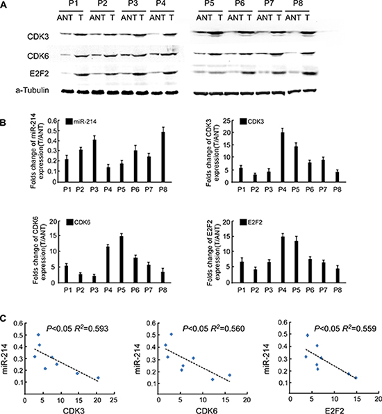 One hundred nanogram of pGL3-CDK3-3′UTR, pGL3-CDK6-3′UTR, pGL3-E2F2-3′UTR, plus 1ng of pRL-TK renilla plasmid (Promega, Madison, WI), were transfected using the Lipofectamine 2000 reagent (Invitrogen) according to the manufacturer’s recommendation. Luciferase and renilla signals were measured at 48 h after transfection using the Dual Luciferase Reporter Assay Kit (Promega) according to a protocol provided by the manufacturer.