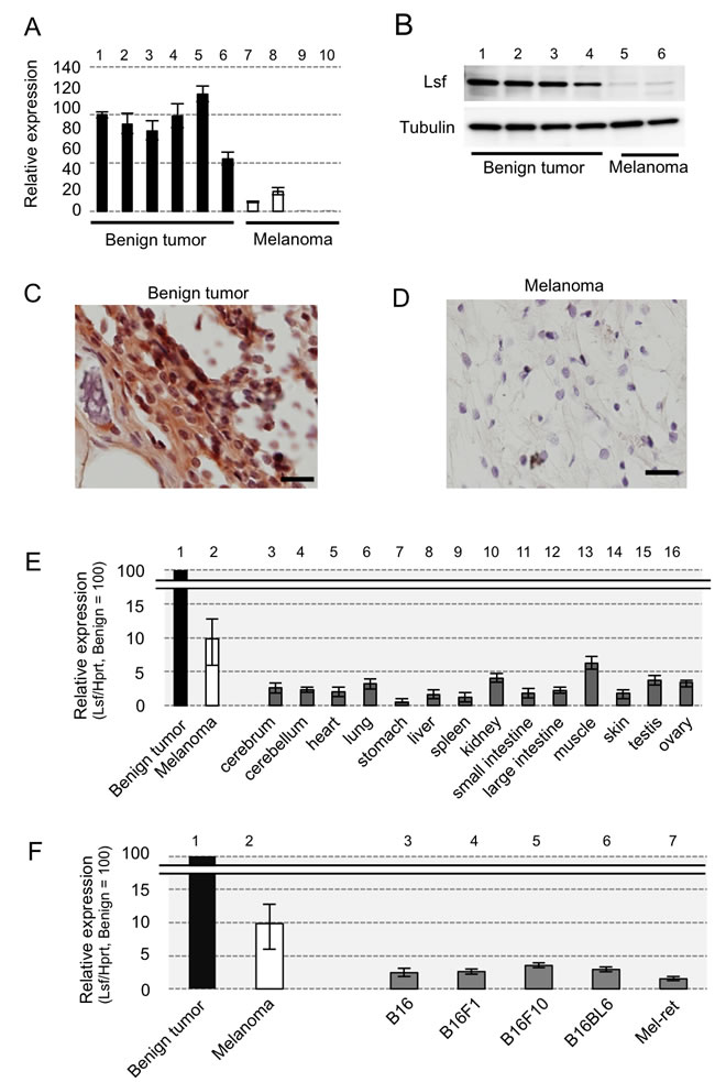 Figure 1: Lsf expression levels in mice. A.-F. Results of RT-qPCR A., E., F., immunoblot B. and immunohistochemical C., D. analyses for benign melanocytic tumors (lanes 1-6 in A., lanes 1-4 in B., and C., lane 1 in E. and F.) and melanomas (lanes 7-10 in A., lanes 5-6 in B., D., lane 2 in E. and F.) from RET-mice, for indicated organs from wild-type mice (lanes 3-16 in E.), and for melanoma cell lines (lanes 3-7 in F.) of B16 and Mel-ret [6]. Hprt (A., E., F.) and α-Tubulin B. were used as internal controls in RT-qPCR and immunoblot analyses, respectively. Results (mean ± SD) are representative of three independent experiments.
