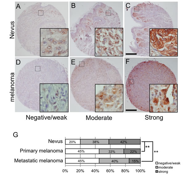 Figure 2: LSF expression levels in melanocytic tumors in humans. A.-F. Representative signal scores for both nevus cell nevus A.-C. and melanoma D.-F. samples are shown as negative/weak (A. and D.), moderate (B. and E.) and strong (C. and F.). Dotted squares show the areas magnified in the inset. Scale bar, 200 µm. G. Percentages classified as negative/weak (white), moderate (light gray) and strong (dark gray) LSF protein expression levels in nevi and primary and metastatic melanomas are shown. Significantly different (**, p < 0.01) from nevi by Fisher’s exact test.