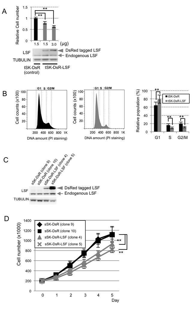 Anchorage-dependent growth was examined in human SK-Mel28 melanoma (tSK-DsR-LSF) cells transiently overexpressing DsRed-LSF fusion protein to elucidate the molecular function. Our cell proliferation assay using crystal violet showed that anchorage-dependent growth in tSK-DsR-LSF cells was decreased by about 19-40% compared to that in control human SK-Mel28 melanoma (tSK-DsR) cells transiently overexpressing DsRed protein (Figure 3A). Flow cytometric analysis showed that 62% in G1 phase of control tSK-DsR cells was increased to 80.5% in G1 phase of tSK-DsR-LSF cells (Figure 3B). Correspondingly, anchorage-dependent growth of human SK-Mel28 melanoma (sSK-DsR-LSF) cells stably overexpressing DsRed-LSF fusion protein was significantly suppressed compared to that of control human SK-Mel28 melanoma (sSK-DsR) cells stably overexpressing DsRed protein (Figure 3C and 3D). Then 3 kinds of LSF-depleted sSK-DsR-LSF cells transfected with 3 kinds of siRNAs for LSF and control NG-sSK-DsR-LSF cells transfected with negative control siRNA were developed. After confirming decreased levels of LSF transcript and protein expression in LSF-depleted sSK-DsR-LSF (1), (2) and (3) cells compared to those in NG-sSK-DsR-LSF cells (Figure S2A, S2B), anchorage-dependent growth was examined. As expected, the level of anchorage-dependent growth of LSF-depleted sSK-DsR-LSF (2) cells was significantly higher than those of sSK-DsR-LSF cells and NG-sSK-DsR-LSF cells and was near to that of sSK-DsR cells (Figure S2C).