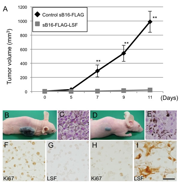 Figure 4: Effect of LSF overexpression on anchorage-independent growth of B16F10 melanoma cells in vivo. A.-I. Tumor volumes A. and macroscopic (B., D.) and microscopic (C., E., F.-I.) appearances in nude mice at 11 days after subcutaneous inoculation of control B16F10 melanoma cells (sB16-FLAG; n=5) (B., C., F., G.) and B16F10 cells stably overexpressing LSF (sB16-FLAG-LSF; n=6) (D., E., H., I.). Results of HE staining (C., E.) and immunohistochemical detection of Ki67 (F., G.) and LSF (H., I.) for the inoculated melanoma are presented. Significantly different (**, p < 0.01) from the control by Student’s t-test. Scale bar, 100 µm.