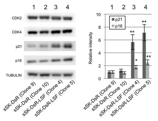 Figure 5: Effect of LSF overexpression on cell cycle regulators in melanoma cells. Representative results of immunoblot analysis for expression levels of cell cycle regulators, CDK2, CDK4, p21CIP1and p16INK4a, in SK-Mel28 cells stably overexpressing DsRed protein (sSK-DsR) (lanes 1 and 2) and DsRed-LSF fusion protein (sSK-DsR-LSF) (lanes 3 and 4) are presented. α-TUBULIN served as an internal control. Graph of relative intensities (means ± SD) of p21CIP1and p16INK4a protein expression levels obtained from three independent experiments are presented. Significantly different (**, p < 0.01; *, p < 0.05) from the control [sSK-DsR (Clone 9)] in each analysis of p21CIP1and p16INK4a by Student’s t-test.