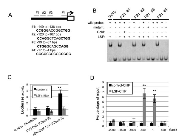 Figure 6: Association of LSF with p21CIP1 promoter sequences in vitro and in vivo. A. Putative CNRG-N6-CNRG motifs in the region of -149 to -136 bps (#1), -120 to -107 bps (#2), -99 to -87 bps (#3) and -17 to -4 (#4) bps from the transcription start site of p21CIP1 are shown. B. Results of the EMSA assay using putative LSF-binding (wild) and mutant DNA probes in the presence or absence of in vitro translated LSF and competitor oligonucleotides (cold) are shown. C. Luciferase activity (mean ± SD) by binding of LSF in the promoter region of p21CIP1 in control parental SK-Mel28 cells, sSK-DsR cells and sSK-DsR-LSF cells in the presence (gray) or absence (black) of transient depletion of LSF. D. The LSF binding of each region in the immunoprecipitates was evaluated by qPCR, and the results are expressed as percentage (mean ± SD) to the input. Significantly different (**, p < 0.01) from the control by Student’s t-test.