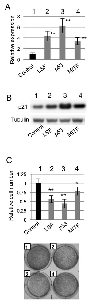 Lastly, the effect of LSF expression on anchorage-dependent growth was examined. Transfection efficiency was undetectably low in NHEM. Therefore, murine immortalized normal melanocytes (melan-a) were used (Figure 7). A previous study showed that p21 transcription was regulated by p53 and MITF [17]. After confirming that transcript and protein expression levels of p21 were increased in melan-a cells transiently overexpressing LSF, p53 and MITF compared to those in control melan-a cells (Figure 7A and 7B), anchorage-dependent growth was examined (Figure 7C). Anchorage-dependent growth was decreased in melan-a cells transiently overexpressing LSF, p53 and MITF compared to that in control melan-a cells (Figure 7C). These results suggest that LSF is associated with anchorage-dependent growth of normal melanocytes as well as melanoma cells.