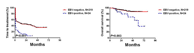 Median TTT was 6 months (range, 1−71 months). Median survival was 74 months (range, 2−83 months). 3-year survival was 89% (95% confidence interval [CI], 87, 91%). At two months after diagnosis 18 subjects in the EBV-DNA-positive cohort were treated vs. 93 of 219 subjects (42% in the EBV-DNA-negative cohort (P < 0.001). Median survival was 60 months (range, 9−74 months) in the EBV-DNA-positive cohort vs. not reached (P < 0.001; Figure 1) in the EBV-DNA-negative cohort.