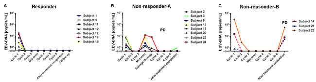 Eighteen subjects with an EBV-DNA-positive test at diagnosis had sequential measurements of EBV copies during therapy and follow-up (Figure 2). Seven patients of therapy responders had a significant reduction of EBV-DNA copies (Figure 2A). In contrast, 6 subjects failing therapy had a rapid increase in EBV-DNA copy numbers (Figure 2B). Three subjects had increases in EBV-DNA copies when they developed Richter transformation (Figure 2C).