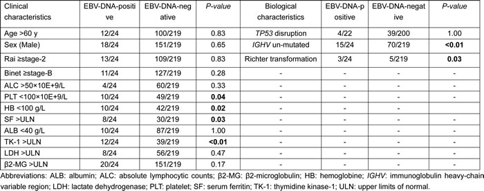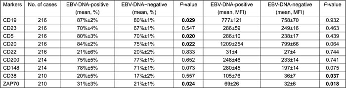 Table 2: The comparison of the expressions of the immunophenotypical markers between EBV-DNA-positive and EBV-DNA-negative CLL subjects