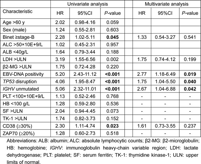Variables significantly associated with TTT interval in univariate analyses were entered into multivariate analyses. Five parameters, Binet ≥stage-B (HR, 1.45; [1.01, 2.09]; P = 0.044), lymphocytes >50×10E+9/L (HR, 1.41 [1.12, 2.32]; P = 0.010), EBV-DNA positivity (HR, 1.85 [1.13, 3.03]; P = 0.014), un-mutated IGHV state (HR, 1.87 [1.28, 2.71]; P = 0.001) and albumin < 40 g/L (HR, 1.17 [1.09, 2.26]; P = 0.015) were significantly associated with TTT interval (Table 3). Variables significantly associated with survival in univariate analyses were entered into multivariate analyses. EBV-DNA-positivity (HR, 2.77 [1.18, 6.49]; P = 0.019), TP53 disruption (HR, 1.75 [1.04, 5.50]; P = 0.040) and un-mutated IGHV state (HR, 2.67 [1.04, 6.88]; P = 0.042) were significantly associated with survival (Table 4).