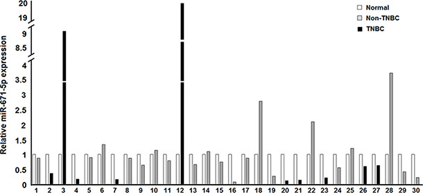 Figure 1: Expression of miR-671-5p in IDC vs. adjacent normal. Black bars depict TNBCs while gray bars are for non-TNBCs, in comparison to the normal in white. Down-regulation of miR-671-5p expression was present in 21 of 30 (70%) of IDC compared with their adjacent normal tissue (p < 0.05).