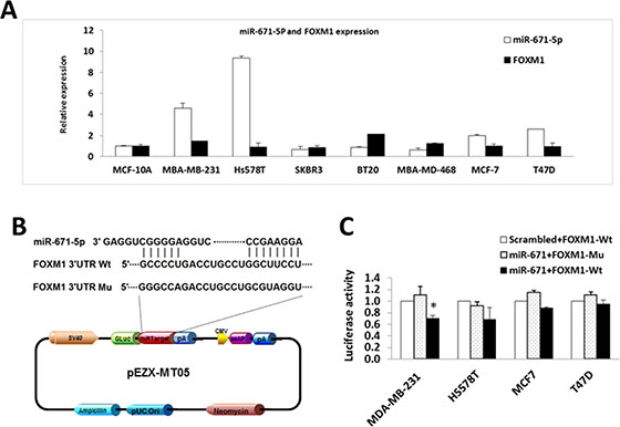 Figure 2: miR-671-5p targets FOXM1 in breast cancer cell lines. (A) Inverse correlated expression of miR-671-5p and its target FOXM1 in breast cancer cell lines. (B) Location of the miR-671-5p binding site at the 3′-UTR of FOXM1 corresponding to the miR-671-5p sequence. (C) Relative luciferase activity was measured in breast cancer cell lines co-transfected with 100 ng of DNA with pEZX-miR-671-5p or pEZX-scrambled control (mock), and 100 ng of pEZX-MT05-FOXM1 (wild type or mutant) by FuGENE reagent (Promega) for 48 h. The data were reported as mean ± S.D. for three independent experiments (*p < 0.05).