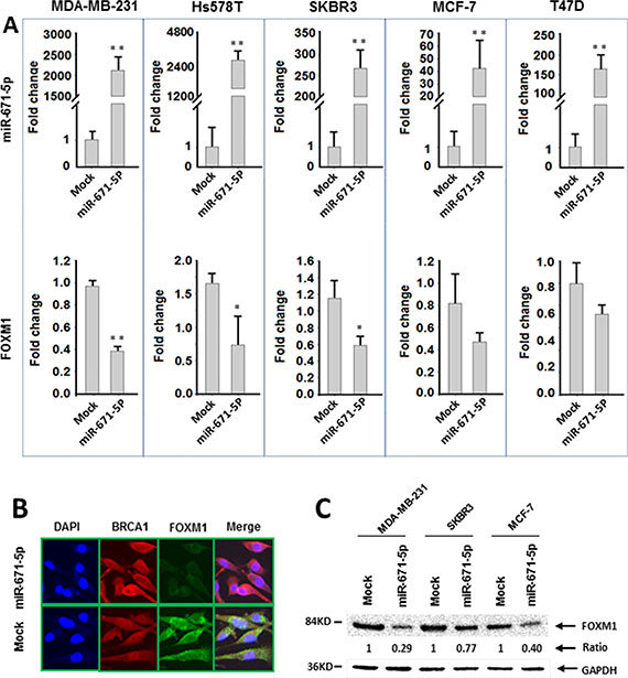 Figure 3: miR-671-5p negatively regulates FOXM1 expression in breast cancer cell lines. (A) qRT-PCR analysis of miR-671-5p and FOXM1 mRNA expression in breast cancer cell lines transfected with miR-671-5p mimic or mock (**p < 0.01, *p < 0.05). (B) Immunofluorescence analysis of FOXM1 protein expression in MDA-MB-231 cells transfected with miR-671-5p or mock. (C) Western blotting analysis of FOXM1 expression in breast cancer cell lines. FOXM1 expression was decreased more significantly in MDA-MB-231 (71%) and MCF-7 (60%) cells in comparison with SKBR3 (23%) cells when miR-671-5p was overexpressed.