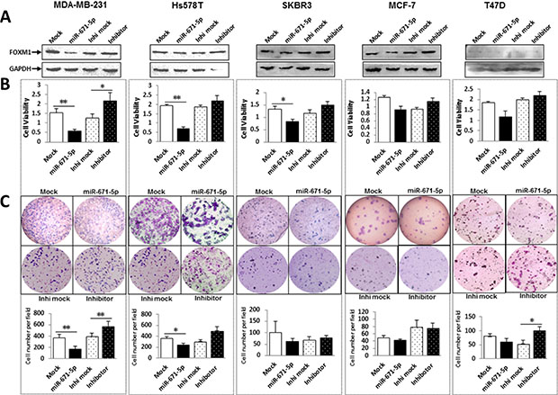 Figure 4: miR-671-5p inhibits proliferation and decreases invasive ability of breast cancer cell lines. (A) FOXM1 protein expression was examined by Western blot after transfection of miR-671-5p mimic and inhibitor. (B) Effects of miR-671-5p on cell proliferation were determined by MTT assays. Proliferative activity was decreased after transfection of miR-671-5p mimic and increased after transfection of miR-671-5p inhibitor compared to the mock control in breast cancer cell lines. Values represent the mean ± S.D. for three independent experiments (**p < 0.01, *p < 0.05). (C) Transwell assays with Matrigel were performed for the invasion activity of breast cancer cells transfected with either miR-671-5p mimic or the mock control. Overexpression of miR-671-5p significantly reduces cell invasion in MDA-MB-231, Hs578T and SKBR3, but only slightly in MCF-7 and T47D. Invasion ability of the cells was displayed as a percentage of the absolute cell number (bottom). Results are displayed as mean data ± SE (**p < 0.01, *p < 0.05). Five fields of unit area on each membrane or whole membrane were counted for cell numbers, and the experiments were repeated three times in triplicate.