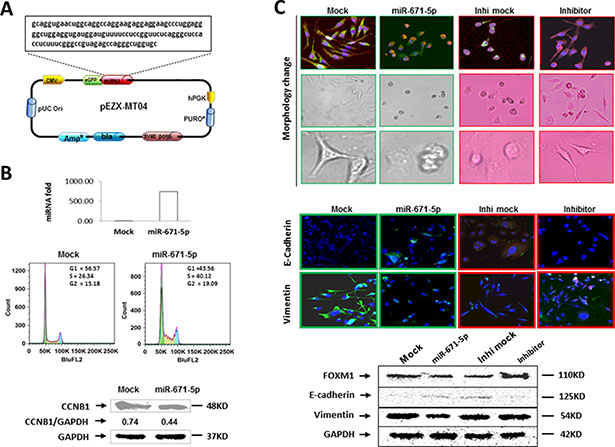 Figure 5: miR-671-5p induces S-phase arrest and inhibits EMT. (A) Schematic diagram of miR-671-5p precursor sequence in pEZX-MR04. (B) Overexpression of miR-671-5p (top) induces S-phase arrest by flow cytometry (middle) and downregulated CCNB1 expression (bottom) in miR-671-5p stable transfected MDA-MB-231 cells when compared with mock transfected cells using Western blot analysis. (C) Overexpression of miR-671-5p shifts MDA-MB-231 cells from EMT to MET phenotype. Top panel showing cell morphology was observed by microscopy in MDA-MB-231 cells transfected with mock and miR-671-5p. Mock transfected MDA-MB-231 cells displayed elongated, irregular fibroblastoid morphology whereas miR-671-5p transfected cells showed a more epithelioid appearance. The middle panel shows immunofluorescence staining of E-cadherin and vimentin in the indicated cells. The bottom panel shows the Western blot analysis of E-cadherin and vimentin protein levels in indicated cells.