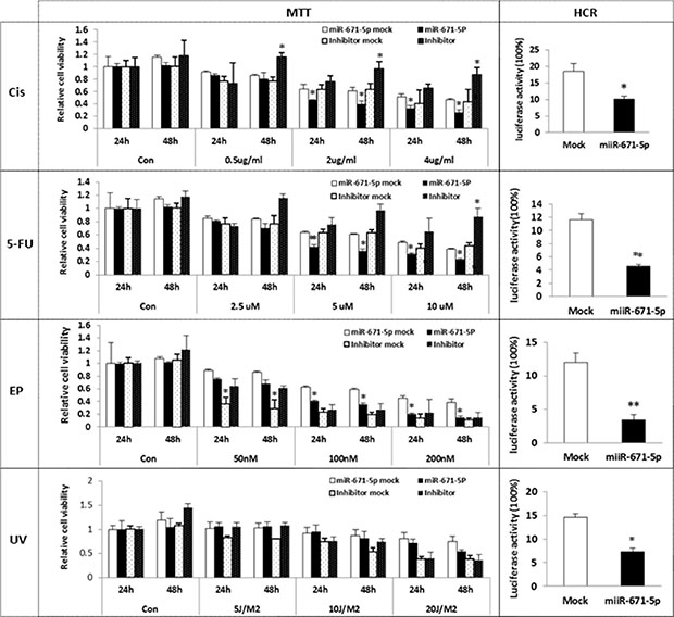Figure 6: Effect of miR-671-5p on sensitivity of breast cancer cell lines to UVC/ Chemosensitivity. miR-671-5p or mock was stable transfected into MDA-MB-231 cell line. The stable transfected MDA-MB-231 cell line was further transfected with miR-671-5p inhibitor or mock. Cells were treated by cisplatin, 5-FU, epirubicin and UVC respectively. Cell sensitivity was measured by MTT assays. miR-671-5p overexpression significantly increased cell sensitivity to cisplatin, 5-FU and epirubicin. Results are displayed as mean data ± SE. **p < 0.01 and *p < 0.05 are considered statistically significant with comparison to the mock.