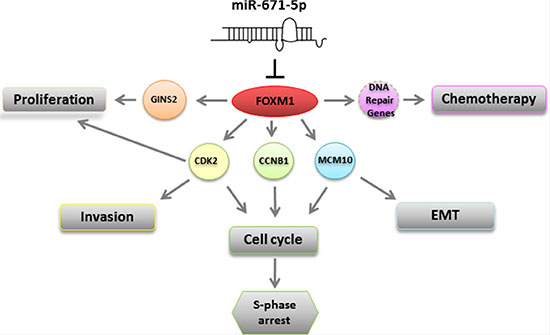 Figure 7: A schematic model for the regulation of miR-671-5p. miR-671-5p directly targets FOXM1. Down-regulation of FOXM1 could 1) inhibit GINS2 and promote cell proliferation; 2) inhibit CDK2 and enhance cell invasion and induce S-phase arrest; 3) inhibit CCNB1 to induce S-phase arrest; 3) inhibit MCM10 which is involved in S-phase arrest and EMT; 4) inhibit CCNB1 to induce S-phase arrest; 5) affect DNA repair gene(s) to function in chemotherapy.