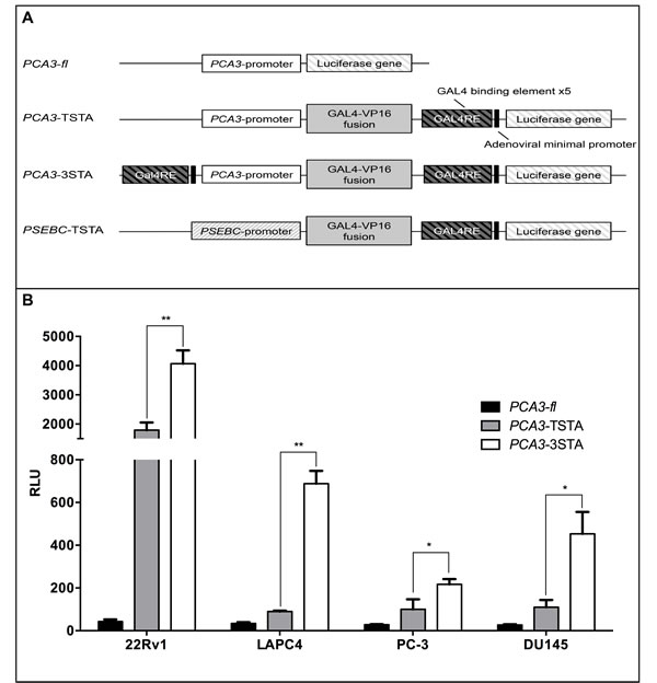 To this point, our data demonstrated that the novel PCA3-3STA system we have generated can amplify expression via PCA3 promoter by over 95-fold. But, importantly, this transcriptionally-based gene expression system maintained exquisite PCa-specificity that does not rely on androgens for its activity.