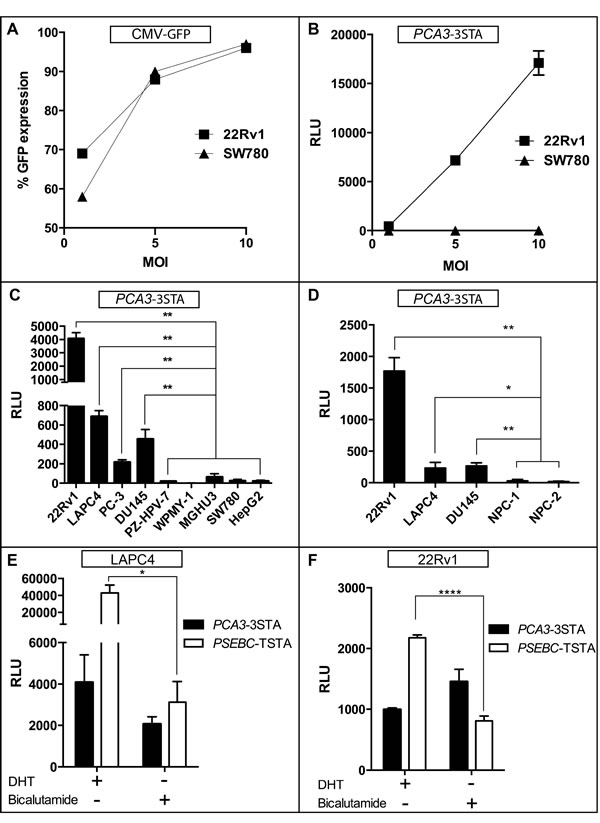 Figure 2: PCA3-3STA: A prostate- and prostate cancer-specific expression system that is not androgen-dependent. A. PCA3-3STA specificity for PCa cells was not due to differences in cell line-specific infectivity. 22Rv1 (PCa) and SW780 (Bladder Ca) cells were infected with CMV-GFP adenovirus at 1, 5, and 10 MOI, and the percentage of GFP expression was found to be comparable in both cell lines. B. PCA3 amplified activity in PCa specificity is not due to enhanced PCa transduction by adenovirus. 22Rv1 and SW780 cells were infected with PCA3-3STA at 1, 5, and 10 MOI. C. PCA3-3STA is highly active in all PCa cell lines tested. PCa (22Rv1, LAPC4, PC-3, DU145), non-PCa (SW780, HepG2), and non-cancerous prostate (PZ-HPV-7, WPMY-1) cells were infected with PCA3-3STA at 5 MOI. Cells were harvested after 72 h of culture. D. PCA3-3STA activity was higher in cancerous than in benign prostate epithelial cells. PCa cells and two primary prostate epithelial cell cultures were infected with PCA3-3STA at 5 MOI. E. and F. PCA3-3STA was prostate specific and not androgen dependent when compared to PSEBC-TSTA. Androgen receptor positive PCa cells (22Rv1 or LAPC4) were infected with either PSEBC-TSTA or PCA3-3STA at 5 MOI and treated with either DHT (10 nM) or bicalutamide (10 μM). The relative fl activity (RLU) was normalized by protein content in each well divided by the SV40 promoter activity in each cell line (RLU = (RLU/μg protein) ÷ (RLU SV40/μg)*100). Each result represents triplicates ± SD; *p < 0.05, **p < 0.01, **** p = < 0.0001.