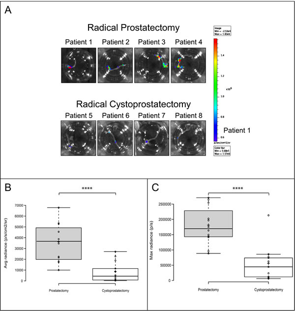 Figure 5: PCA3-3STA activity can discriminate benign from primary cancerous prostate glands. Prostate biopsies were harvested from either radical prostatectomy specimens operated for prostate cancer or radical cystoprostatectomy specimens operated for bladder cancers. Each biopsy was then exposed to PCA3-3STA for 24 hours and then cultured for an additional 48 hours. PCA3-3STA activity was then quantified after luciferin addition using a BLI apparatus. A. Representative biopsies of radical prostatectomy or cystoprostatectomy specimens after BLI. Four patients (3 biopsy per patient) in each group were imaged and the images shown represent the biopsy with the highest radiance for each patient. B. and C. Box plots were built from the photon emission quantification ((B) Average radiance (p/s/cm2), (C) Max radiance per biopsy (p/s)) obtained from 12 and 13 prostate biopsies from 4 and 5 consecutive patients in the PCa and benign groups, respectively. ****p < 0.0001.