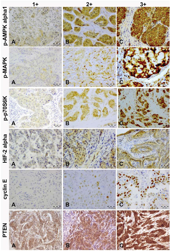Figure 2: Immunohistochemical intensity scoring of p-AMPK alpha1, p-MAPK, p-p70S6K, HIF-2 alpha, cyclin E and PTEN (magnification, x20). A. weak; B. moderate; C. strong.