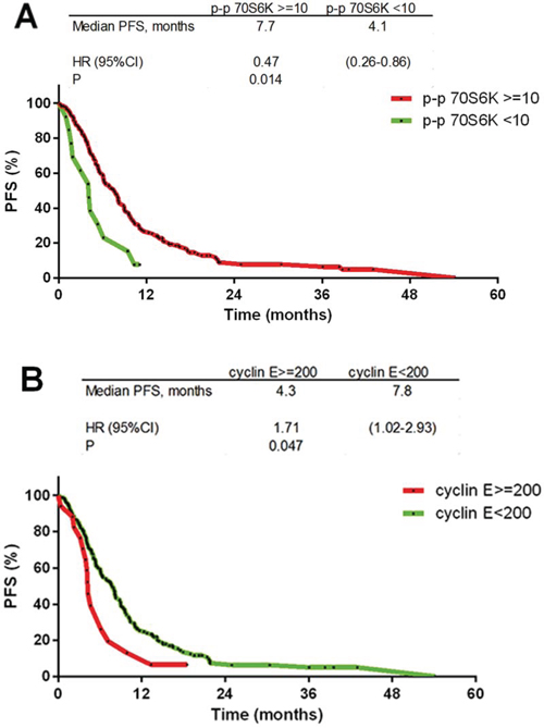 Figure 3: Kaplan-Meier progression free survival curves. A. p-p70S6K ≥ 10 staining H-score (HR 0.47; p = 0.014); B. cyclin E ≥ 200 staining H-score (HR 1.71; p = 0.05).