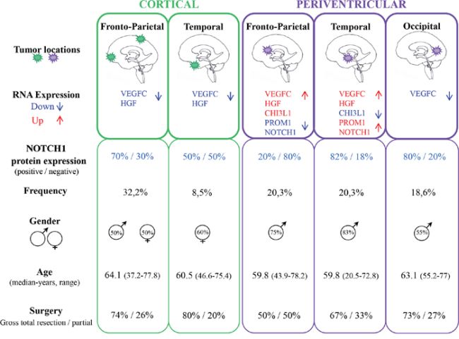 In summary, periventricular glioblastomas differed from cortical glioblastomas, and periventricular tumors were a heterogeneous group with distinct subgroups based on molecular characteristics. In particular, in contrast with PV-FP and PV-O subtype, PV-T glioblastomas were characterized by a high expression of the mesenchymal marker VEGFC and the proneural and CSC markers NOTCH1 and PROM1 that could be potential targets for specific therapies. Whether these data suggest that glioblastomas from PV-T location derived from specific Glioma stem-like cells this remains to be demonstrated. Limited numbers of cases studied and intratumoral heterogeneity [37] indicate the requirement of further studies to support present observations.