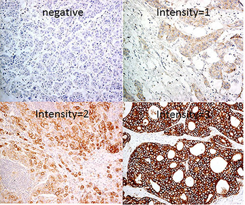 A total of 1,093 primary invasive breast cancers were included in this cohort. Details of the clinic-pathological features are summarized in Table 1. Overall, 941 cases (86.1%) were negative for FGFR1 and 152 cases (13.9%) were positive. Representative FGFR1 staining is shown in Figure 1.