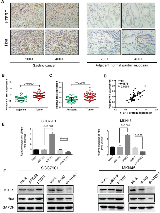 Further, we investigated whether hTERT could regulate Hpa in GC cells. We quantitated Hpa expression in SGC7901 and MKN45 cells using qPCR and western blot analysis. Interestingly, we observed that the mRNA and protein levels of Hpa were markedly increased by overexpression of hTERT. Inversely, the expression of Hpa was reduced when hTERT was down-regulated by shRNA vectors (Figure 1E and 1F). Collectively, these findings suggested that hTERT exerted a positive role in regulating Hpa mRNA and protein expression in GC cells.