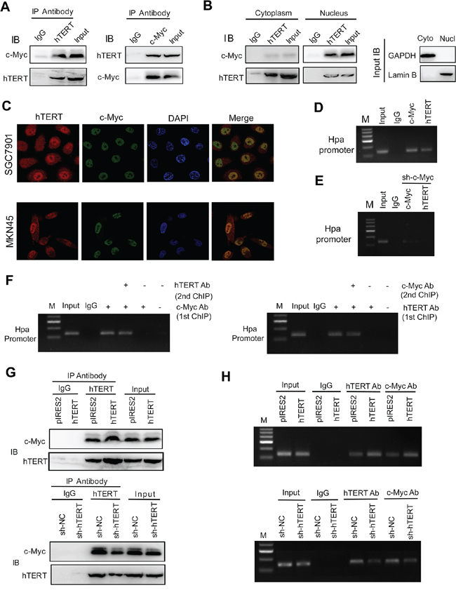 Figure 3: hTERT interacts with c-Myc and regulates the binding of the hTERT/c-Myc complex to the heparanase promoter. A. The total cell lysates of SGC7901 cells were prepared for immunoprecipitation (IP) with antibodies against hTERT or c-Myc, respectively. Rabbit IgG served as a negative control. An aliquot of cell lysate was used as an Input control. B. Cytoplasm and nuclear lysates of SGC7901 cells were prepared for IP with anti-hTERT or anti-c-Myc and then evaluated by IB. C. The subcellular localization and the colocalization of hTERT and c-Myc were tested by dual immunofluorescence using confocal microscopy. D. hTERT and c-Myc co-existed in the heparanase promoter region. ChIP assays were performed using antibody against c-Myc or hTERT. E. Binding of the c-Myc/hTERT complex to promoter was mediated by c-Myc. SGC7901 cells were transfected with sh-c-Myc vectors, and then ChIP was performed using an antibody against c-Myc or hTERT. F. hTERT and c-Myc were present in the same protein complex on the heparanase promoter. Soluble chromatin from SGC7901 cells was first incubated with anti-c-Myc or anti-hTERT antibodies. The ReChIP assay was similarly processed using anti-hTERT or anti-c-Myc, respectively. G. hTERT regulates the interaction of c-Myc and hTERT. Co-IP was performed and evaluated by IB with the indicated antibodies. H. hTERT regulates the recruitment of c-Myc to the heparanase promoter. SGC7901 cells were transfected with vectors as indicated. Soluble chromatin was prepared for the ChIP assays.