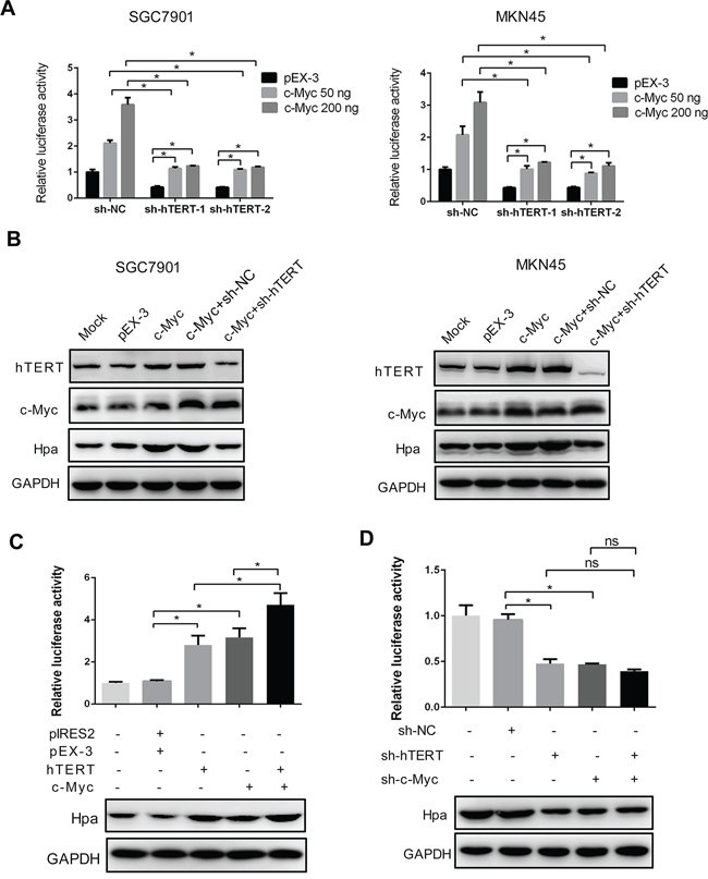 We investigated whether the promoter activity of Hpa was dependent on the intact complex of hTERT and c-Myc. Interestingly, we found that the elevated promoter activity induced by overexpression of hTERT or c-Myc could be abolished by the c-Myc shRNA or hTERT shRNA in SGC7901 and MKN45 cells (Figure 2F and Figure 4A). Similarly, knockdown of hTERT inhibited the c-Myc-stimulated expression of Hpa (Figure 4B). These results strongly suggested that the promoter activity of Hpa was closely dependent on the interaction between these two proteins. Furthermore, we transiently transfected hTERT, c-Myc plasmids or the combination of these two plasmids into cells and performed luciferase assays. Consistently, either hTERT or c-Myc overexpression could increase the promoter activity of Hpa. Moreover, overexpression of both hTERT and c-Myc could stimulate much higher promoter activity and protein expression (Figure 4C). Conversely, either hTERT shRNA or c-Myc shRNA reduced the promoter activity and protein expression, whereas the combination of these two shRNAs was not able to further reduce Hpa expression (Figure 4D). Taken together, these findings demonstrated that hTERT might act as a co-activator of c-Myc to transactivate the promoter activity of Hpa, and the intact complex is essential for Hpa expression.