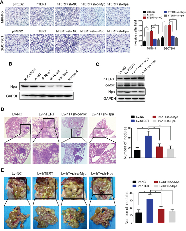 Figure 6: hTERT promotes the invasion and metastasis of gastric cancer cells through c-Myc and heparanase in vitro and in vivo. A. c-Myc and heparanase knockdown impaired hTERT-enhanced invasion of gastric cancer cells in vitro. The invasive properties of the cells were analyzed using an invasion assay with a Matrigel-coated plate. All of the experiments were performed at least three times (P < 0.001). B. and C. Western blot analysis was performed to confirm the transfection efficiency of sh-Hpa and the lentivirus vectors. D. c-Myc and heparanase knockdown abolished hTERT-enhanced tumor pulmonary metastasis. The black circles in the sections reveal the tumor focus that was formed in the lung. The histogram shows the calculated number of metastasis nodules (P < 0.01). E. c-Myc and heparanase knockdown abolished hTERT-enhanced tumor peritoneal dissemination. SGC7901 cells transfected with the indicated vectors were injected into nude mice. The number of tumor nodules was calculated (P < 0.01).